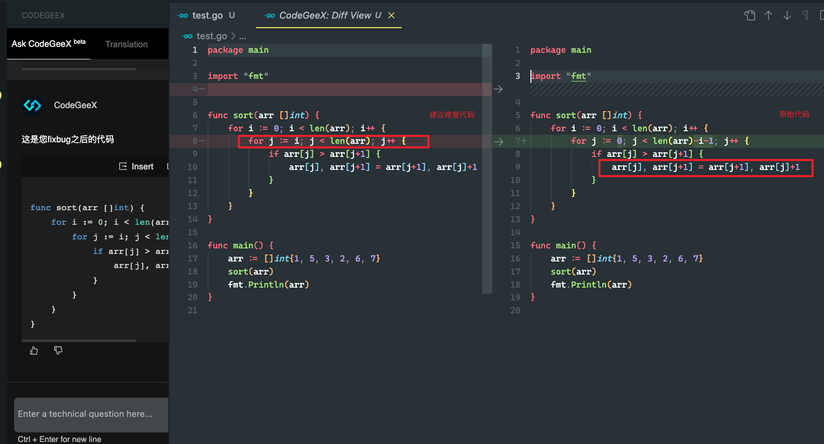 我故意将 arr[j], arr[j+1] = arr[j+1], arr[j] 调整成 arr[j], arr[j+1] = arr[j+1], arr[j],想让它修复下代码,提供了对比视图,左边是修改后的代码,右边是原始代码,可惜修复得不对,这方面还有待优化。