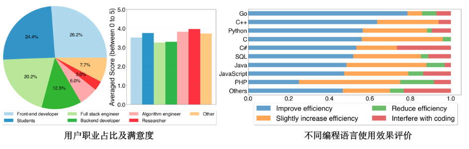 对上百名用户进行问卷调研,涵盖前后端工程师、算法工程师、学生、研究者等, 83.4%的用户认为 CodeGeeX 插件有助于提高编程效率。