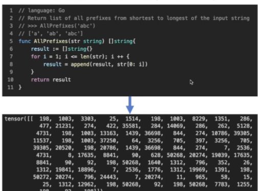 处理代码缩进,将代码片段进行分词,得到 token 序列,再将 token 对应到词表中的 ID,得到 ID 序列。