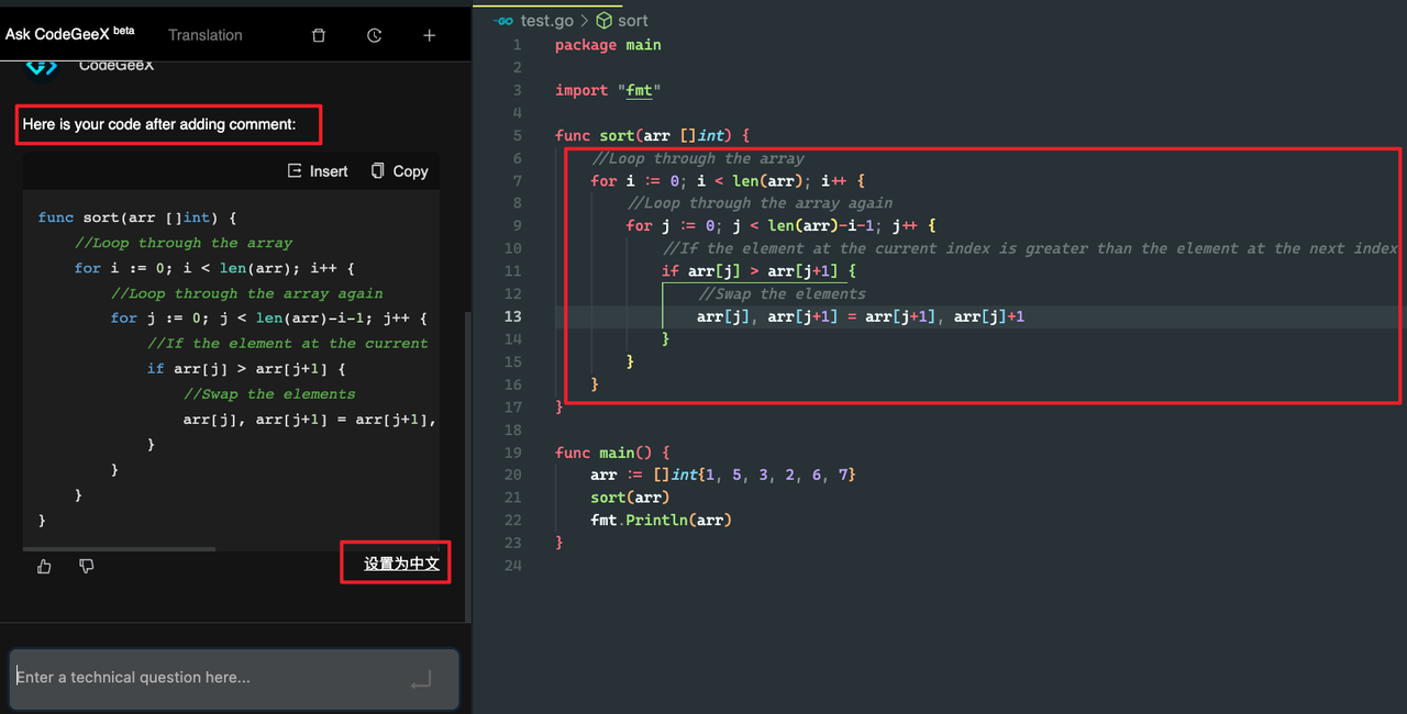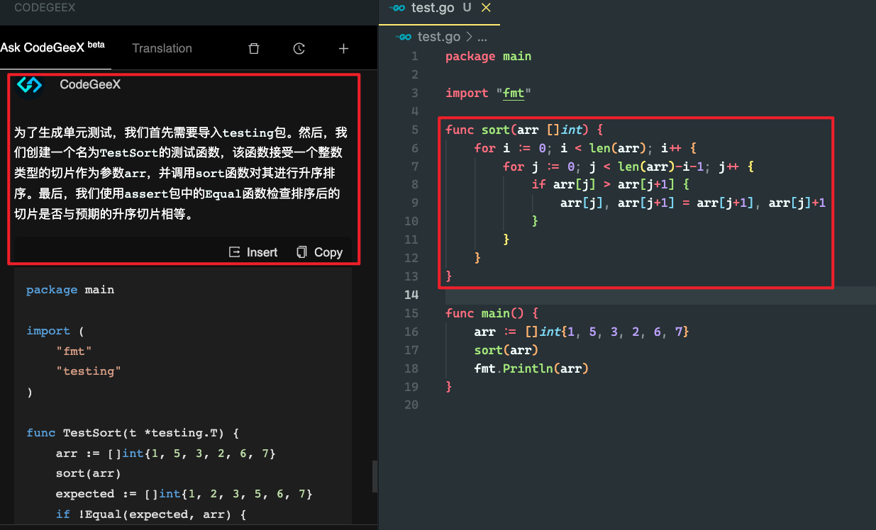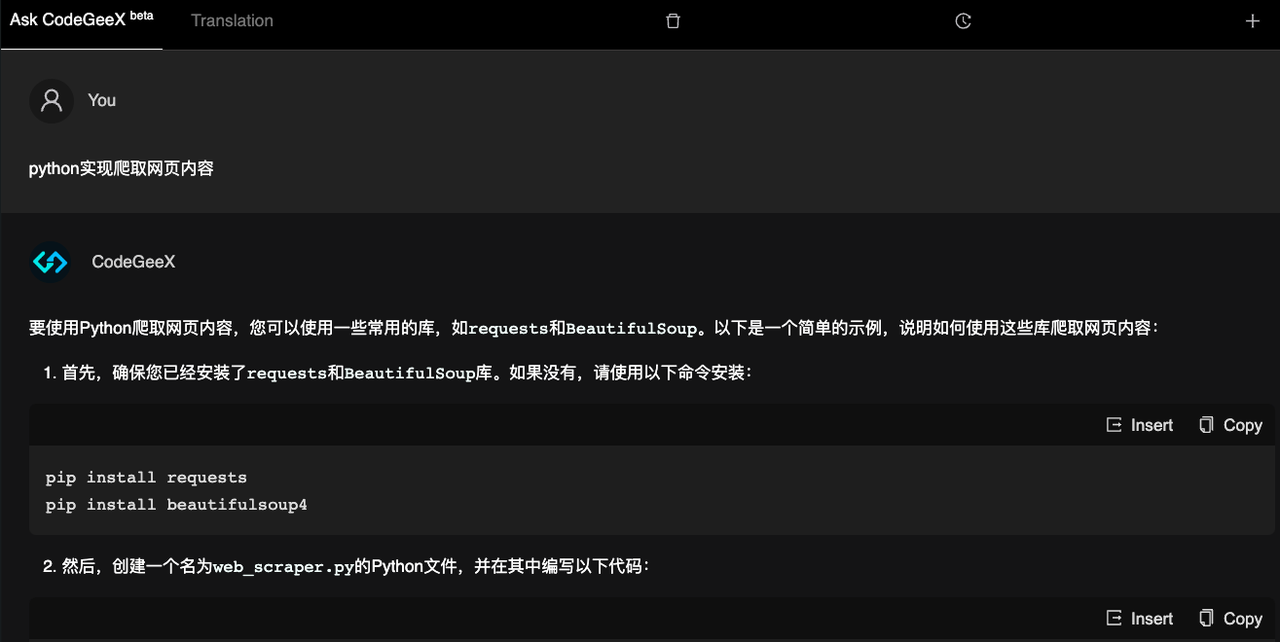 选中一段代码,然后点击 Ctrl+Alt+T 进入翻译模式,根据提示选择要翻译的目标语言,CodeGeeX 将自动识别当前编辑器中代码的语言,并进行翻译,点击翻译结果上方的“insert”即可将翻译结果插入文件。
