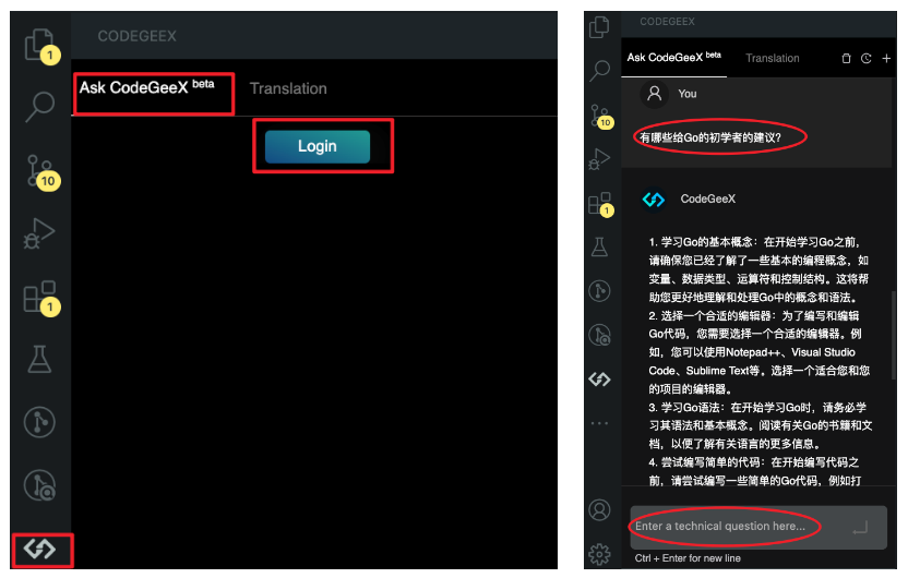 通过智能问答机器人可以实现其它扩展功能,左边菜单找到 CodeGeex 插件,点击 ”login“ 按钮登录即可与机器人聊天。