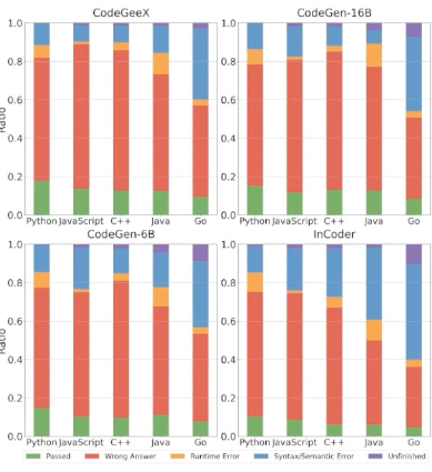 总共分为四种类型:语法错误、编译错误、输出错误、输出正确,语法错误和编译错误占比低,主要是输出错误。