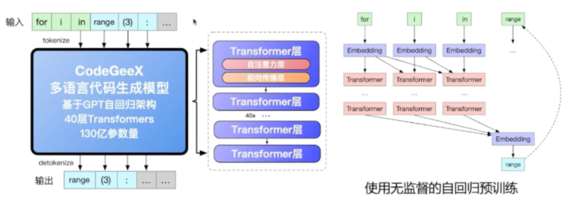 CodeGeex 模型基于 GPT 架构的自回归模型,由 40 层 transformer 组成,总计参数量达 130 亿(OpenAI 的 Codex 模型,具有 120 亿(12B)参数),它使用自然语言或代码 token 作为输入,输出下一个 token 的概率。